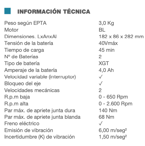 - Tecnología de detección del efecto rebote (AFT). Apaga la herramienta para proteger el motor y evitar rebotes si la velocidad de rotación se ralentiza repentinamente.