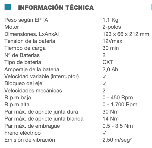 - Batería de 2,0Ah de carga rápida gracias al sistema de refrigeración del cargador que evita que se caliente la batería durante la carga.